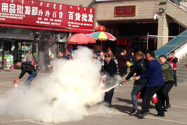 第三項首先由穿戴消防服裝的演習實操人員進行現(xiàn)場滅火演練后,商戶門也參與了滅火演練;