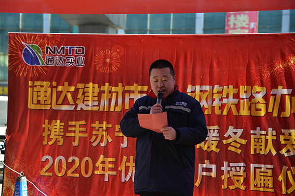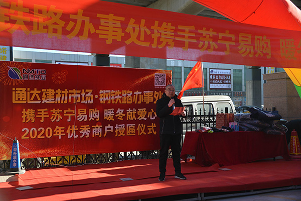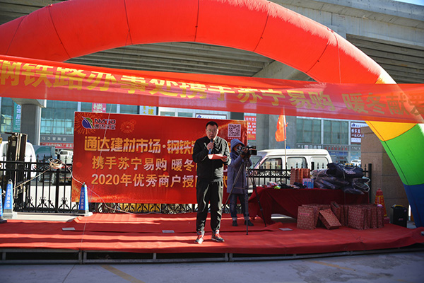 2020年11月29日舉行了通達(dá)建材市場(chǎng)2020年暖冬活動(dòng)以及優(yōu)秀商戶(hù)授匾儀式。整體活動(dòng)分為三部分,1.由市場(chǎng)主導(dǎo)定制沖鋒衣,蘇寧易購(gòu)出資,共同為市場(chǎng)以及周邊裝卸工提供暖冬定制沖鋒衣。2.聯(lián)合鋼鐵路辦事處,召集周邊環(huán)衛(wèi)工人,發(fā)放采購(gòu)好的保暖 慰問(wèn)品和定制水杯。3.公布優(yōu)秀商戶(hù)名單,并進(jìn)行授匾儀式。王總在活動(dòng)當(dāng)中講到“我們要共同努力克服每一個(gè)困難,只要路的對(duì)的,就不怕路遠(yuǎn)”樹(shù)立了商戶(hù)對(duì)未來(lái)的信心。整體過(guò)程由首府直通車(chē)全程參與,活動(dòng)期間鋼鐵路辦事處領(lǐng)導(dǎo)的講 話(huà)也是非常認(rèn)可我們建材市場(chǎng)的工作。