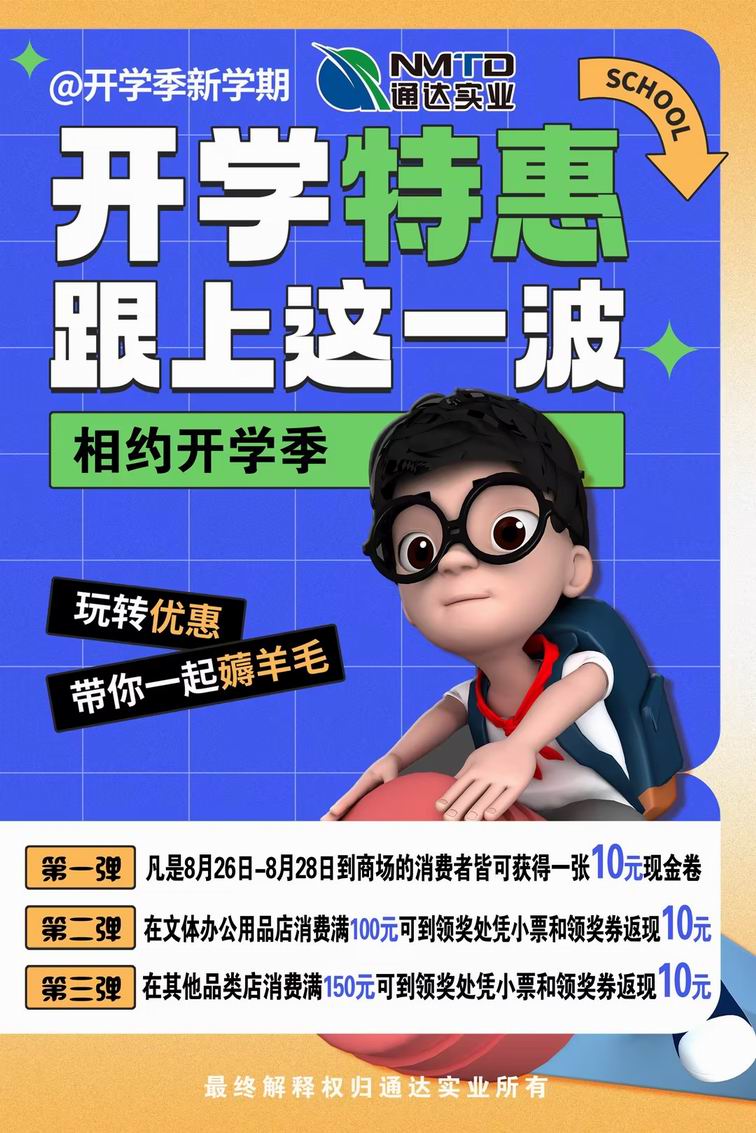 9月臨近,又迎來一年開學的日子。每一年的開學,令眾多學子向往,充滿希翼和對未知的渴望,它開啟了童年、少年、青年的求知夢想,記錄了稚嫩、豆蔻、青蔥的歲月年華。8月底,通達商場推出開學季促銷活動,全商場特賣一降到底,新學期用品推出特價,為學子獻上開學大禮。