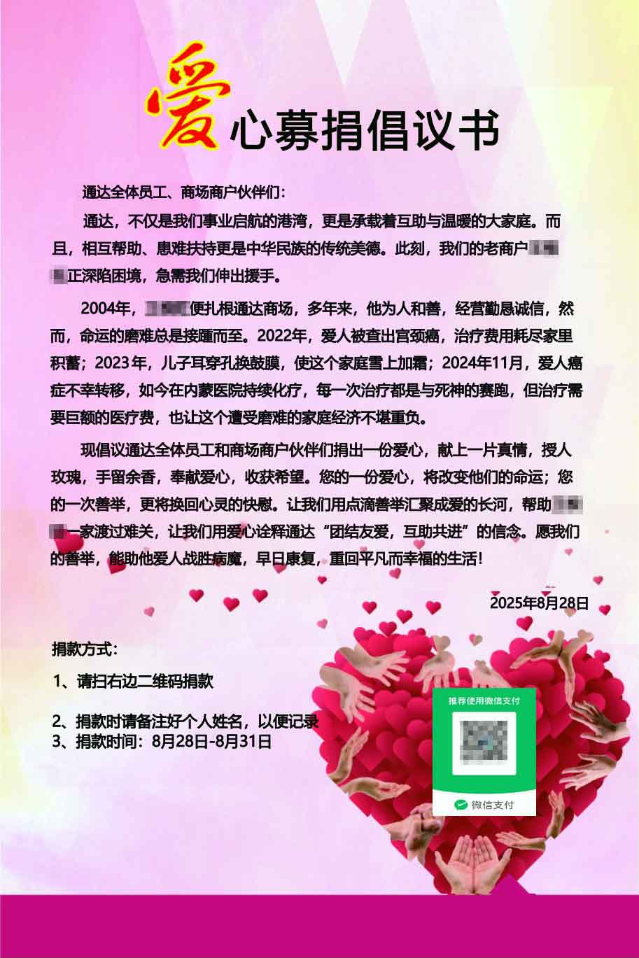 通達(dá)商場商戶W老板及愛人,扎根商場二十余年,多年來,為人和善,經(jīng)營勤懇誠信,然而,命運(yùn)多舛,世事無常,2022年W老板愛人被查出宮頸癌,治療費(fèi)用耗盡家里積蓄;2024年11月,癌癥不幸轉(zhuǎn)移,如今在內(nèi)蒙醫(yī)院持續(xù)化療,巨額的治療費(fèi)讓這個家庭已不堪重負(fù)。