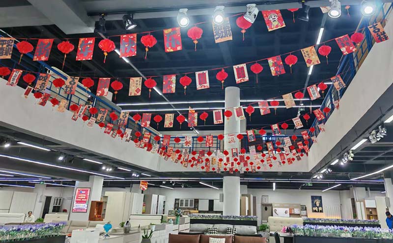 在氛圍布置上,南站市場聚焦兩大市場特點精準發(fā)力。家具市場以“溫馨整潔”為核心,暖色調彩燈纏繞于立柱與天井之間,天井懸掛的新年彩帶與紅燈籠縱橫交錯,搭配現(xiàn)代燈光,營造出溫馨雅致的購物氛圍。樓梯處的臺階貼滿產品指示地貼,從沙發(fā)、茶幾到全屋定制,清晰的分類指引與“選通達,更舒心”的標語,既方便消費者逛店,也傳遞出市場對商戶經營的支持。市場入口的玻璃門上,“2026新年快樂”“馬年吉祥”等貼紙與紅色拉手相呼應,讓進門的顧客第一時間感受到節(jié)日氛圍。